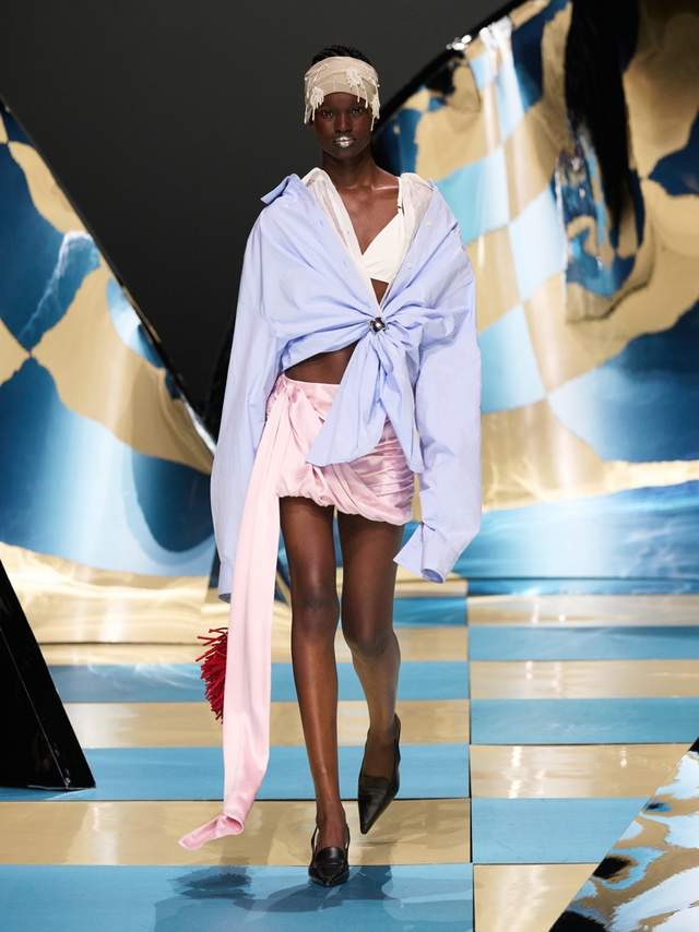 束带、抽绳、卫衣面料等休闲运动元素经由创意化的柔和剪裁——如束拢的气球状半裙,更具空气感和活力感。