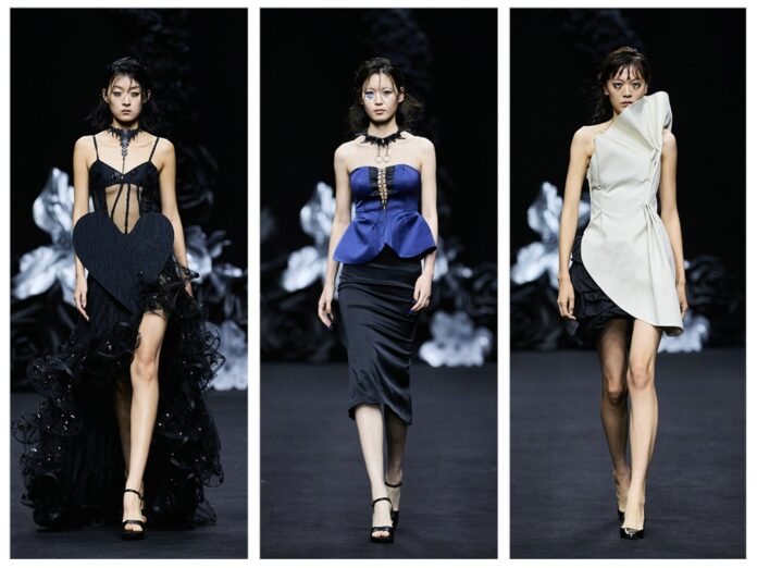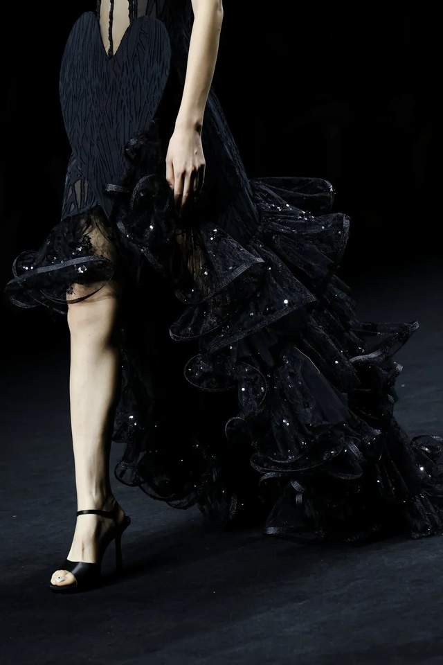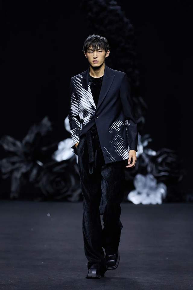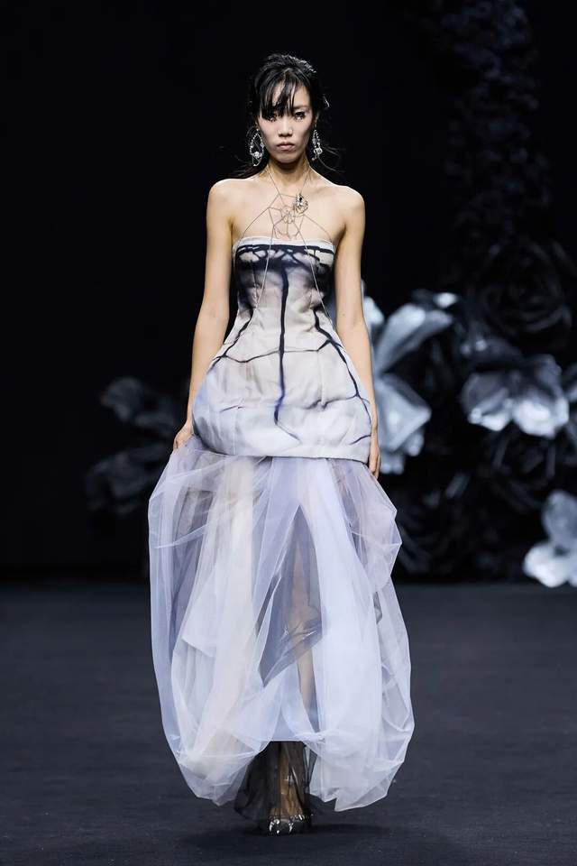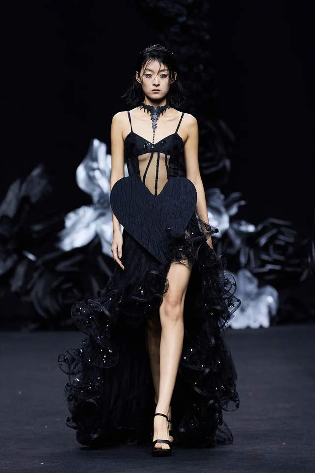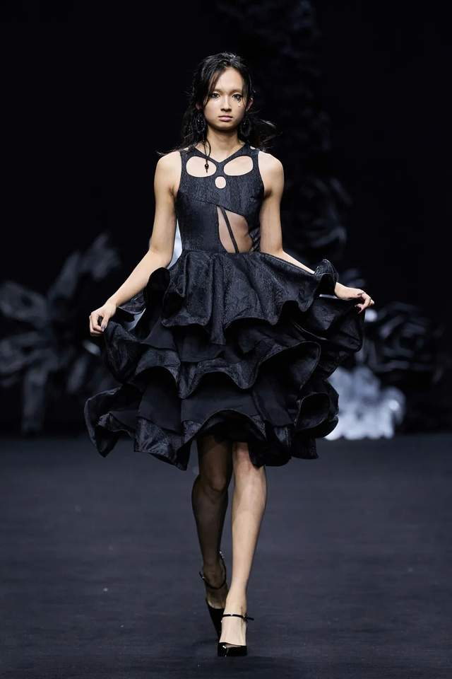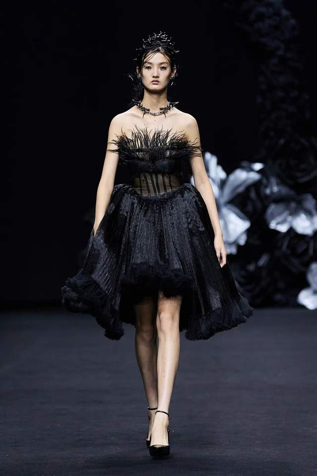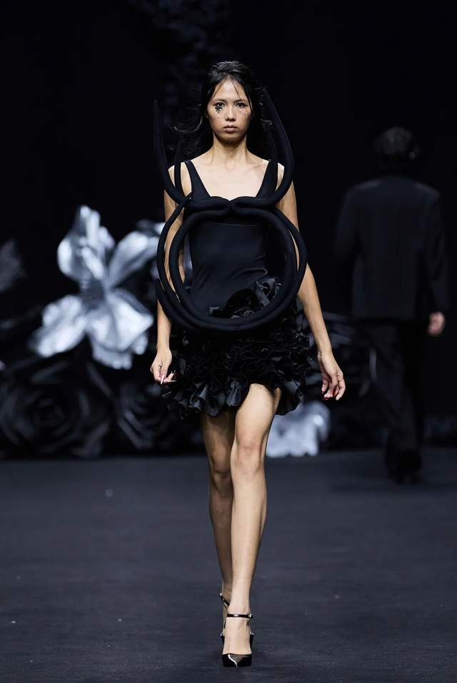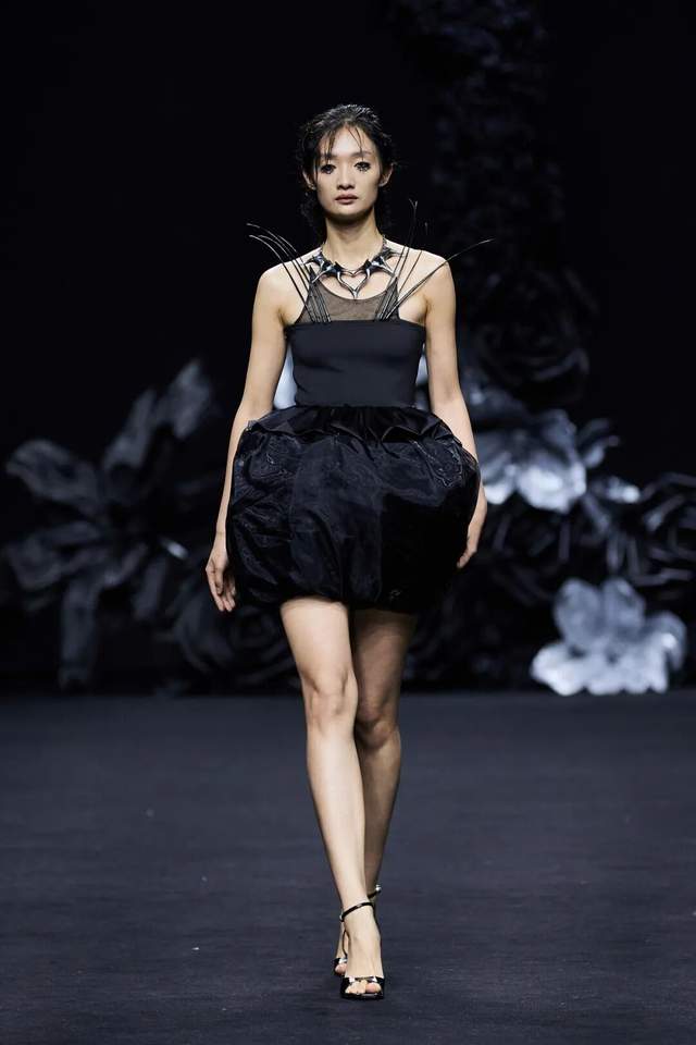 黑色不仅是死亡的色彩,更是无限可能的底色。通过不同材质黑色哑光皮革的冷峻、醋酸缎面的流光、闪光网纱的朦胧,构建黑暗中潜藏的生命力。黑白花朵、藤蔓的几何纹理以印花形式在缎面和薄纱上呈现,将凋零和盛放同时凝固,表达“向死而生”的悖论之美。