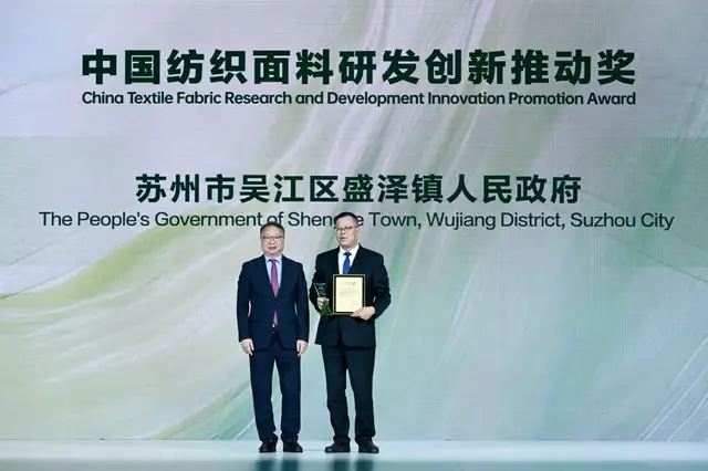 自2015年起,中国生态环保面料设计大赛与盛泽结下深厚缘分,八届并肩同行,不仅为纺织行业绿色转型搭建了专业平台,更以实际行动迈出了产业可持续发展的升级步伐。大赛授予盛泽镇人民政府“中国纺织面料研发创新推动奖”。