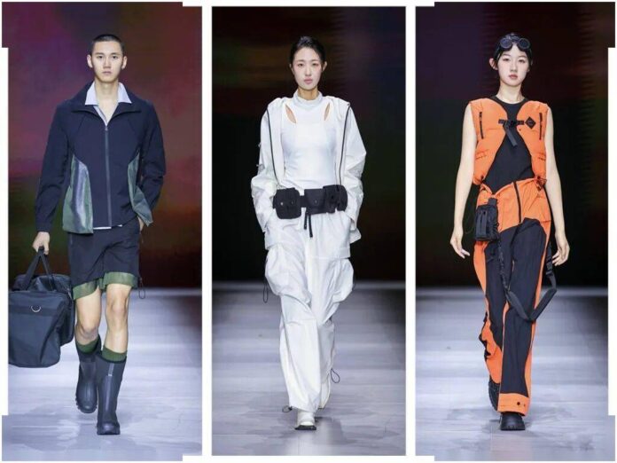 JIAYAO*AidenYFeng 2025苏州湾时尚周新品发布聚焦在反乌托邦美学,将机能主义、未来科技结合防护功能需求相结合形成的时尚概念,通过功能性面料、独特的外观设计和模块化细节来展现一种脏乱、破旧、个性化的废土美学效果。