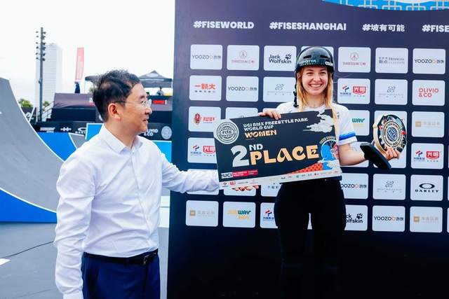 (东方国际集团总裁 朱毅先生 为自由式小轮车公园赛世界杯上海站女子组亚军得主颁奖)