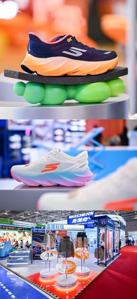 作为连续七年参展企业,斯凯奇锚定”舒适行走专家”这一精准定位,通过呈现完整的舒适生态与扎实的公益实践,打造了一个科技感与人文温度并存的沉浸式体验空间。展区集中展示了带有Slip-ins闪穿功能的Go Walk健步系列、Go Run跑步系列、GO Trail系列与SKECH-HEAT温暖科技系列,共同构成强大的”舒适科技矩阵”,清晰勾勒出品牌满足不同需求的产品图谱与创新实力,为消费者实现全场景舒适生活提供了完整解决方案。