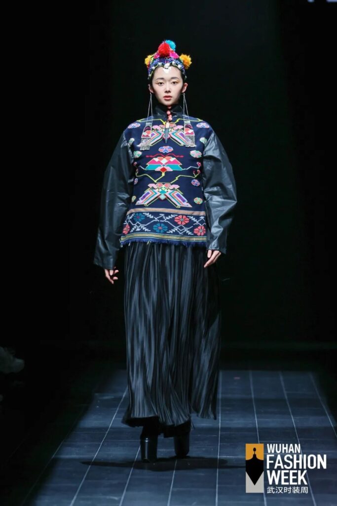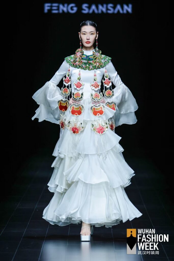 非遗创新承楚风,传统美学焕活力。FENG SANSAN・冯三三以“阳新物语”为主题亮相闭幕秀,灵感源于湖北本土非遗“阳新布贴”。品牌以阳新布贴“有图必有意” 的吉祥内涵为底色,通过大块贴布与“遇折回转”的精细绣工展现匠心,同时重构西兰卡普的图案语言,以产业化、实用化的设计手法,让非遗从技艺走向生活,实现从小众传承到大众穿着的当代转化。为推动非遗进一步融入当代生活,系列还引入国家级非遗 “香云纱”染整技艺,对这一素有“软黄金”之称的面料进行亲民化改造,强调实穿性与舒适度,结合产业化思路,让传统香云纱以更轻盈、更现代化的形态走进日常,完成非遗从“技艺保护”到“生活美学”的价值转化,让楚文化基因在时尚舞台上焕发新生。