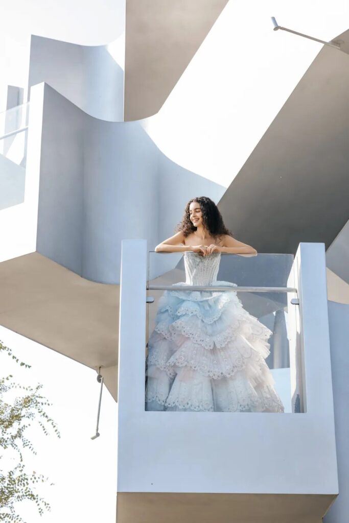 高定诗意融水韵,流光溢彩展匠心。世界著名华裔设计大师Professor Jimmy Choo OBE,周仰杰亲自指导的THE ATELIER带来“潮汐絮语”系列,以《草叶集》为灵感,将潮汐律动缝进2026春夏系列。设计师从诗意水韵中汲取灵感,以非对称剪裁与波浪裙摆勾勒水的万千姿态,施华洛世奇水钻与金属丝绣在面料上流转,宛若将整片湖光披于身。烫钻、亮片与薄纱叠映水色,银线绣出的波纹随步生光,精心打造的压轴之作,以进口面料与鱼骨勾勒出流畅线条,内衬的微型冷光灯串更是点睛之笔,在秀场光影中与水韵主题呼应,营造出如梦似幻的高定美学氛围,展现国际顶尖设计力量的精湛工艺与创意巧思。