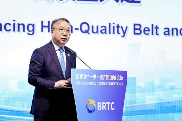 中国纺织工业联合会会长孙瑞哲以“高质量共建‘一带一路’共筑全球产业协同融合新未来”为题,发表了主旨演讲。