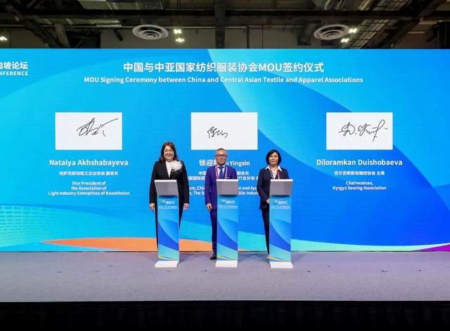 中国纺织工业联合会副会长、中国国际贸易促进委员会纺织行业分会会长徐迎新,与哈萨克斯坦轻工企业协会副会长Natalya Akhshabayeva、吉尔吉斯斯坦缝纫协会主席 Diloramkan Duishobaeva签约,标志着中哈、中吉纺织行业在产业链合作、技术交流等领域将建立长期稳定的合作机制。