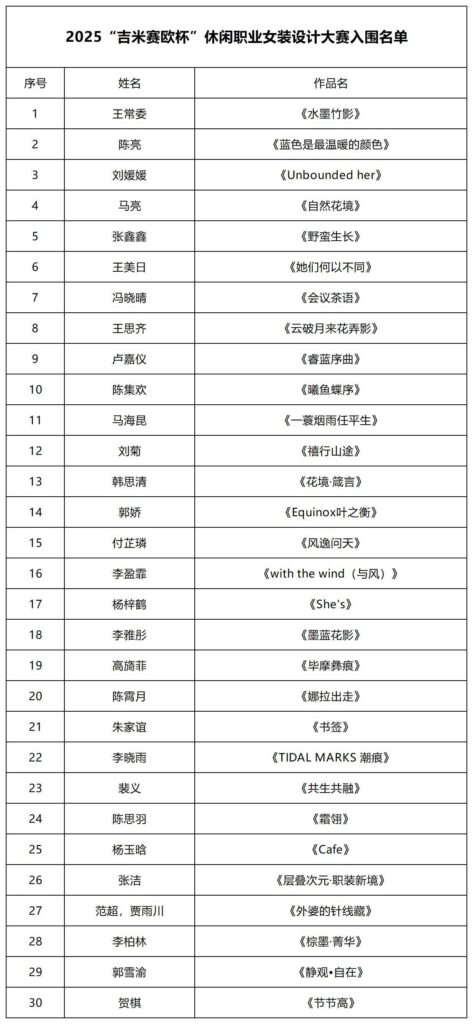 2025“吉米赛欧杯”休闲职业女装创新设计大赛初评工作于近日圆满结束。经过评委会严格、公正的多轮筛选,最终30名设计新锐从众多参赛者中脱颖而出,凭借对大赛主题“她·叙事”的独特诠释、卓越的创意表达能力以及对品牌风格的深刻理解成功入围。这些选手将获得由组委会提供的专项服装制作补贴,并进入成衣制作环节,为总决赛全力备战。(入围名单详见表格)