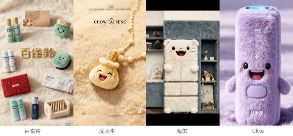 契合全民共创热潮,横跨科技、食饮、美妆、日百、服饰、珠宝等全品类,500+头部品牌一起茸里茸气,如大疆、小米、海尔、伊利、瑞幸、多邻国、Ulike、百雀羚、周生生、蕉下等,品牌商品一键毛茸茸+头像升级为毛茸版,巧妙借力“毛茸茸”热潮解锁营销新玩法,完成了品牌温度与市场热度的双重转化。