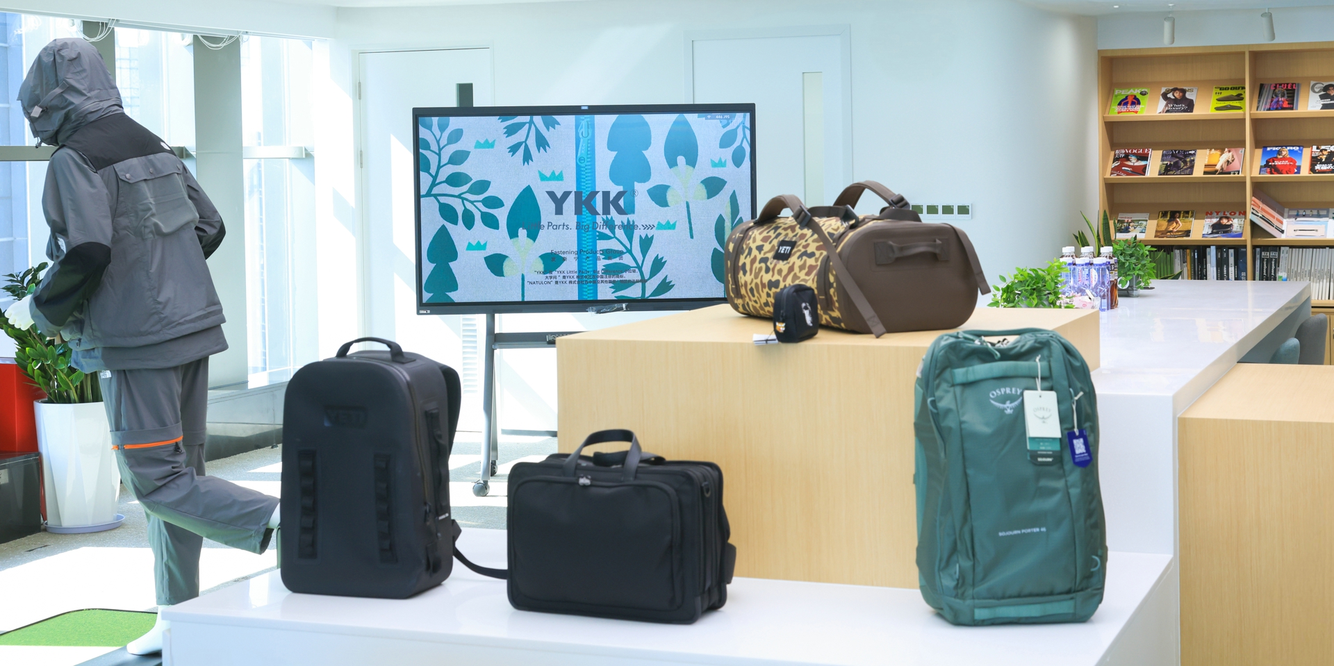 步入展厅,首先映入眼帘的是由全色系YKK防水拉链组成的色彩趋势区,融合全球流行趋势与功能创新;紧随其后的是涵盖数百种材质、色彩与功能的全景产品库,全面展现YKK在拉链领域的技术广度与前瞻视野;而陈列其中的品牌样衣与箱包成品,则生动演绎了“辅料如何驱动主设计”的转化逻辑。