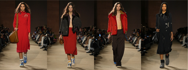 本季外套设计的核心亮点聚焦在校队夹克,其材质以纯皮革、皮革拼接羊毛呈现,并首次推出全剪羊毛款。并叠搭70年代风格的修身短款夹克,其短腰长袖的设计加强了对比例的把控。除此之外,外套系列还加入了多款经典外套,如短外套、剪羊毛和麂皮大衣,其中部分款式用以仿皮草领口点缀,延续复古气息。