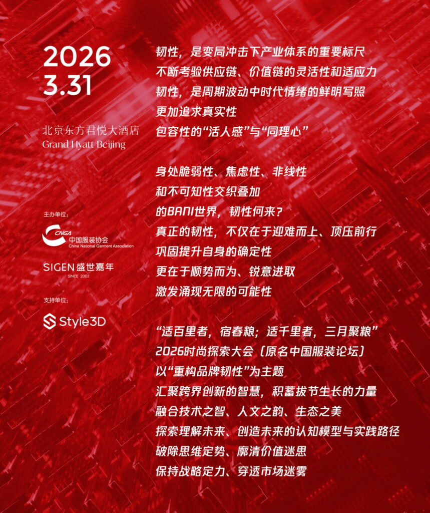 2026年3月31日,全新升级的时尚探索大会,将以“重构品牌韧性”为核心主题,在北京东方君悦大酒店正式启幕。大会由中国服装协会、北京盛世嘉年国际文化发展有限公司主办,凌迪Style3D支持。届时来自经济学界、技术前沿、品牌实践与设计创新的跨界嘉宾们将汇聚一堂,从宏观到微观,从技术到人文,拆解“韧性”的多重维度,共同积蓄品牌穿越周期的生长力量,探索理解未来、创造未来的认知模型与实践路径。