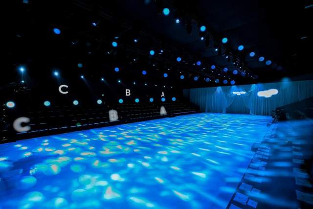秀场以蓝绿色为主调,层层帘幔构筑出流动的海岸意象,为整场发布奠定了沉浸式的视觉基调。