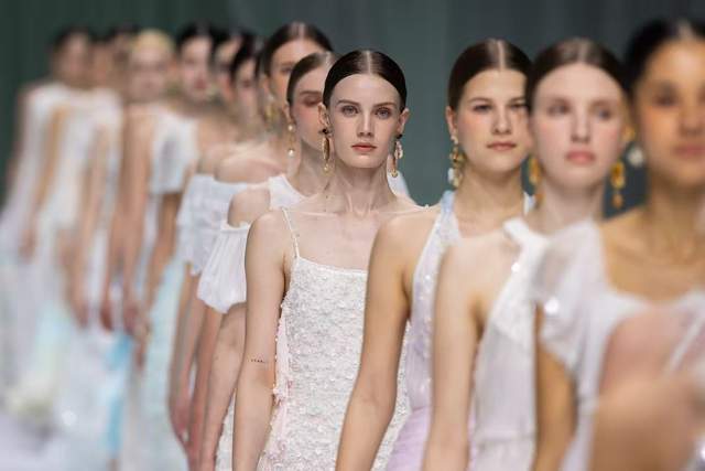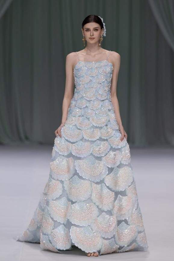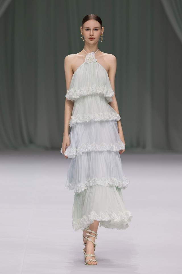 手工搓褶与立体钉珠工艺贯穿本季,被大量运用于礼服与成衣之中,模拟水珠洒落与水波闪烁的微妙细节。每一件作品在行走间呈现细腻的光影变化,使服装本身成为海岸线上的叙事载体。对低饱和度色彩与轻盈材质的细致研究,创造出兼具松弛轮廓与精致工艺的穿着体验。