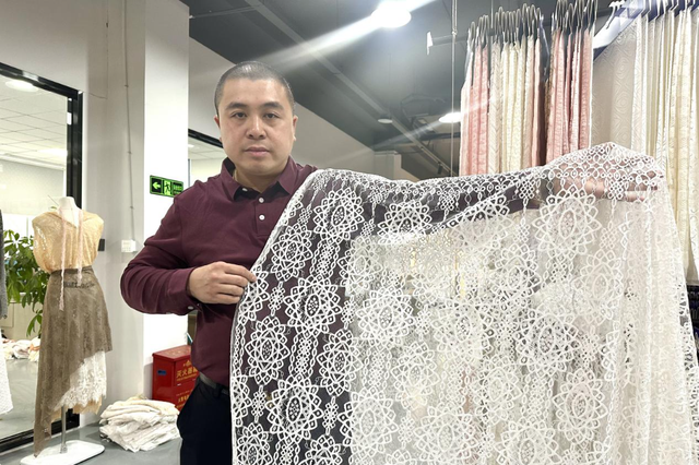 “我们一直专注于蕾丝这一细分赛道,在材料、花型、工艺上下功夫。”公司总经理林竞松表示。据悉,花册纺织已连续参展纺博会十余届,本届将带来三大新品系列:仿绣花立体蕾丝、融入苗族非遗元素的国风蕾丝,以及采用环保纤维的新材料蕾丝,共计三十余款。